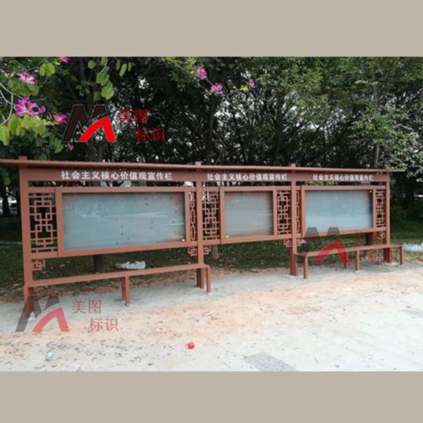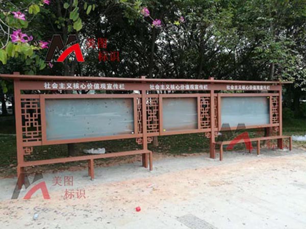 产品描术:主材,镀锌钢板、方管、钢化玻璃;经过切割、焊接、成型。表面喷漆,白色社会主义核心价值观宣传栏为立体字。旁边有两张凳子,与社会主义核心价值观宣传栏同等 材料同等制作工艺;社会主义核心价值观宣传栏有三块宣传栏位置,用夜压杆打开可以换画。
